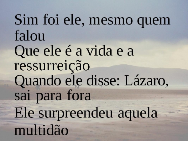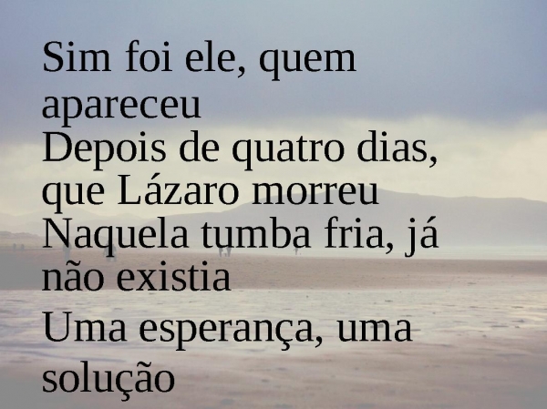 - Sim foi ele, quem aparec eu Depois de quatro dias, que Lázaro morreu Naquela tumba fria, já não existia Uma esperança, uma soluç ão