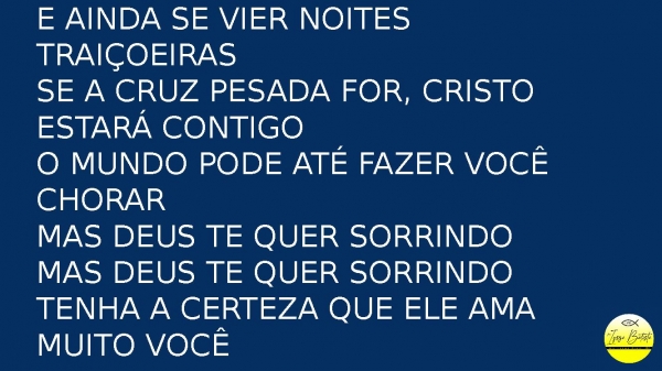 - E ainda se vier noites traiçoeirasSe a cruz pesada for, Cristo estará contigoO mundo pode até fazer você chorarMas Deus te quer sorrindoMas Deus te quer sorrindoTenha a certeza que ele ama muito você