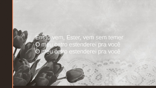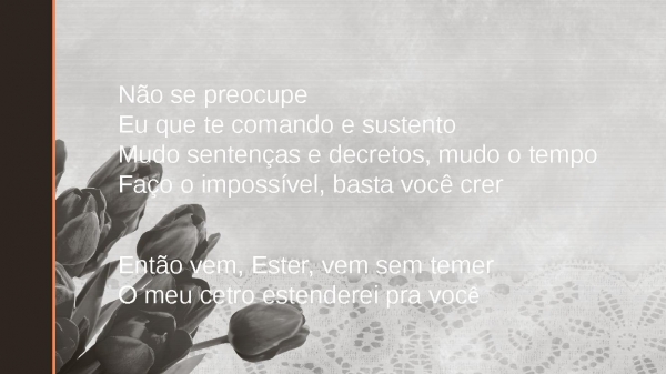 - Então vem, Ester, vem sem temerO meu cetro estenderei pra vocêNão se preocupeEu que te comando e sustentoMudo sentenças e decretos, mudo o tempoFaço o impossível, basta você crer