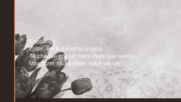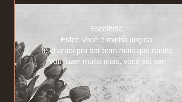 - EscolhidaEster, você é minha ungidaTe chamei pra ser bem mais que rainhaVou fazer muito mais, você vai ver