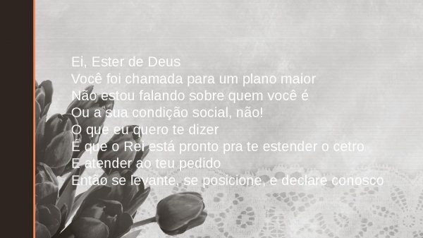 - Ei, Ester de DeusVocê foi chamada para um plano maiorNão estou falando sobre quem você éOu a sua condição social, não!O que eu quero te dizerÉ que o Rei está pronto pra te estender o cetroE atender ao teu pedidoEntão se levante, se posicione, e declare conosco