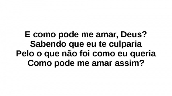 - E como pode me amar, Deus?Sabendo que eu te culpariaPelo o que não foi como eu queriaComo pode me amar assim?