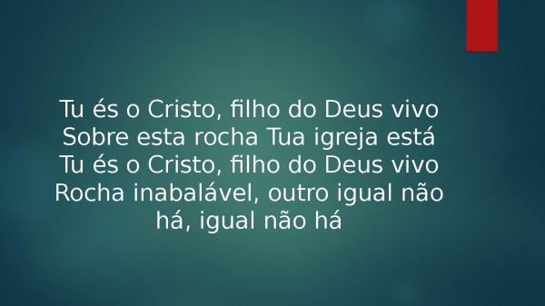 - Tu és o Cristo, filho do Deus vivoSobre esta rocha Tua igreja estáTu és o Cristo, filho do Deus vivoRocha inabalável, outro igual não há, igual não há