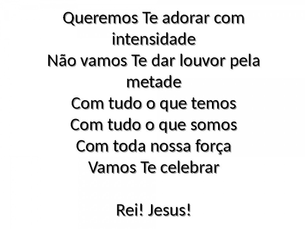 - Queremos Te adorar com intensidadeNão vamos Te dar louvor pela metadeCom tudo o que temosCom tudo o que somosCom toda nossa forçaVamos Te celebrarRei! Jesus!