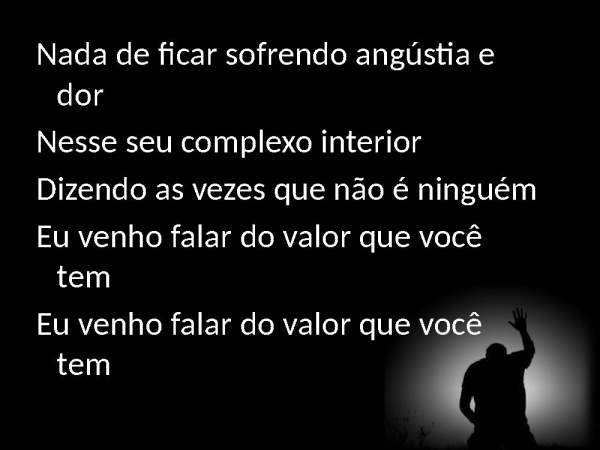 - Nada de ficar sofrendo angústia e dorNesse seu complexo interiorDizendo as vezes que não é ninguémEu venho falar do valor que você temEu venho falar do valor que você tem