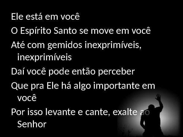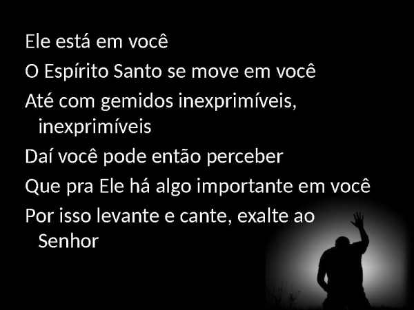 - Ele está em vocêO Espírito Santo se move em vocêAté com gemidos inexprimíveis, inexprimíveisDaí você pode então perceberQue pra Ele há algo importante em vocêPor isso levante e cante, exalte ao Senhor