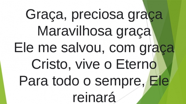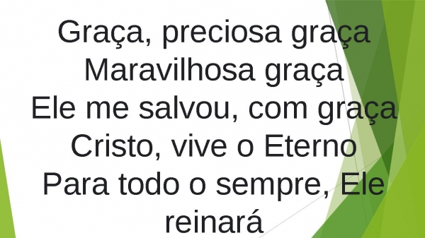 - Graça, preciosa graçaMaravilhosa graçaEle me salvou, com graçaCristo, vive o EternoPara todo o sempre, Ele reinará