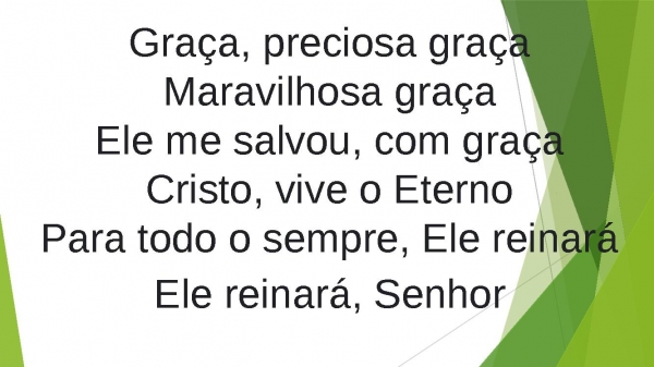 - Graça, preciosa graçaMaravilhosa graçaEle me salvou, com graçaCristo, vive o EternoPara todo o sempre, Ele reinaráEle reinará, Senhor