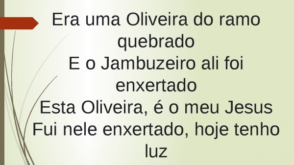 - Era uma Oliveira do ramo quebradoE o Jambuzeiro ali foi enxertadoEsta Oliveira, é o meu JesusFui nele enxertado, hoje tenho luz