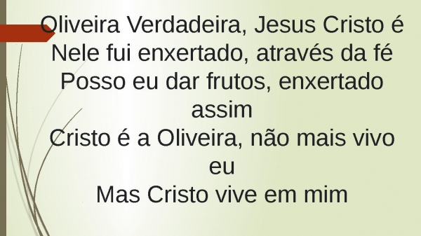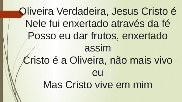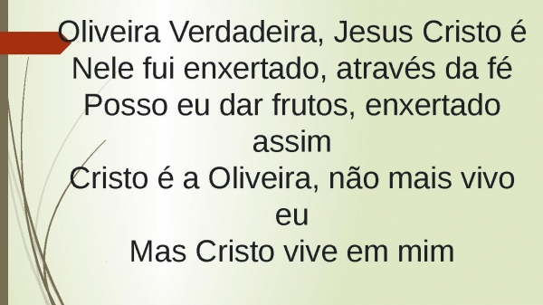 - Oliveira Verdadeira, Jesus Cristo éNele fui enxertado, através da féPosso eu dar frutos, enxertado assimCristo é a Oliveira, não mais vivo euMas Cristo vive em mim