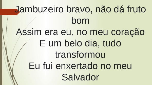 - Jambuzeiro bravo, não dá fruto bomAssim era eu, no meu coraçãoE um belo dia, tudo transformouEu fui enxertado no meu Salvador