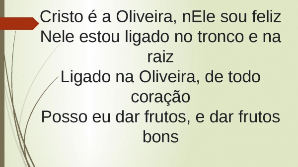 - Cristo é a Oliveira, nEle sou felizNele estou ligado no tronco e na raizLigado na Oliveira, de todo coraçãoPosso eu dar frutos, e dar frutos bons