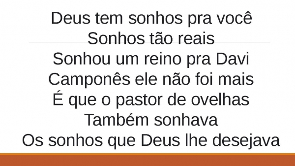 - Deus tem sonhos pra vocêSonhos tão reaisSonhou um reino pra DaviCamponês ele não foi maisÉ que o pastor de ovelhasTambém sonhavaOs sonhos que Deus lhe desejava