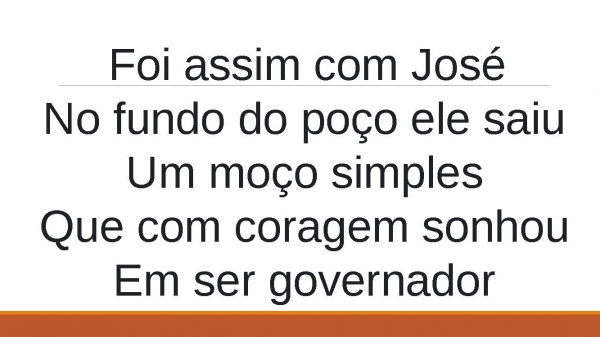 - Foi assim com JoséNo fundo do poço ele saiuUm moço simplesQue com coragem sonhouEm ser governador