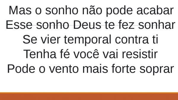 - Mas o sonho não pode acabarEsse sonho Deus te fez sonharSe vier temporal contra tiTenha fé você vai resistirPode o vento mais forte soprar