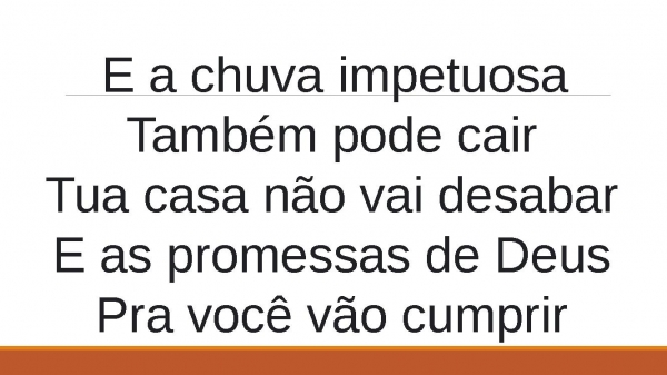 - E a chuva impetuosaTambém pode cairTua casa não vai desabarE as promessas de DeusPra você vão cumprir