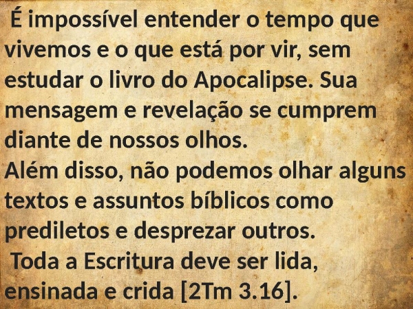 - É impossível entender o tempo que vivemos e o que está por vir, sem estudar o livro do Apocalipse. Sua mensagem e revelação se cumprem diante de nossos olhos. Além disso, não podemos olhar alguns textos e assuntos bíblicos como prediletos e desprezar outros. Toda a Escritura deve ser lida, ensinada e crida [2Tm 3.16].