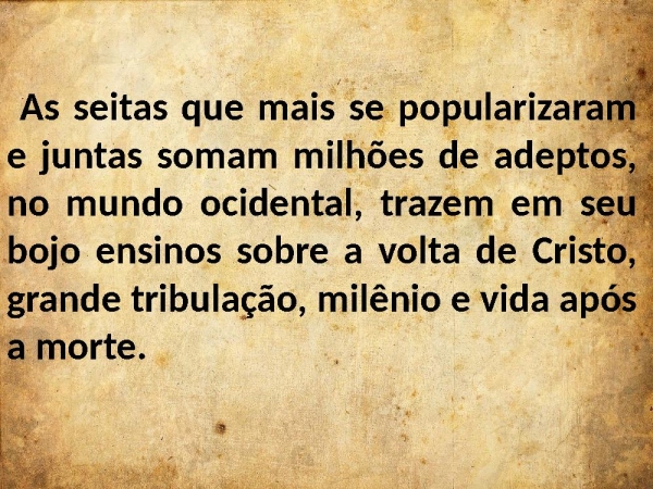 - As seitas que mais se popularizaram e juntas somam milhões de adeptos, no mundo ocidental, trazem em seu bojo ensinos sobre a volta de Cristo, grande tribulação, milênio e vida após a morte.