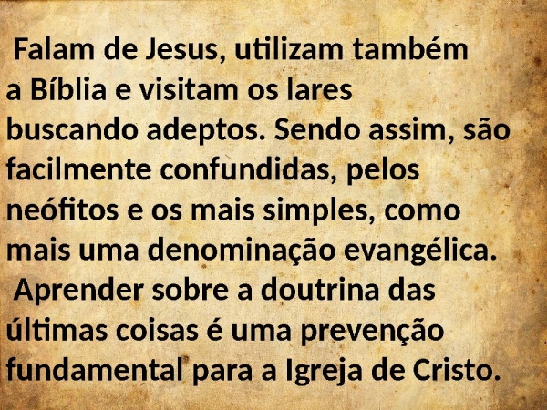 - Falam de Jesus, utilizam também a Bíblia e visitam os lares buscando adeptos. Sendo assim, sãofacilmente confundidas, pelos neófitos e os mais simples, comomais uma denominação evangélica. Aprender sobre a doutrina das últimas coisas é uma prevenção fundamental para a Igreja de Cristo.
