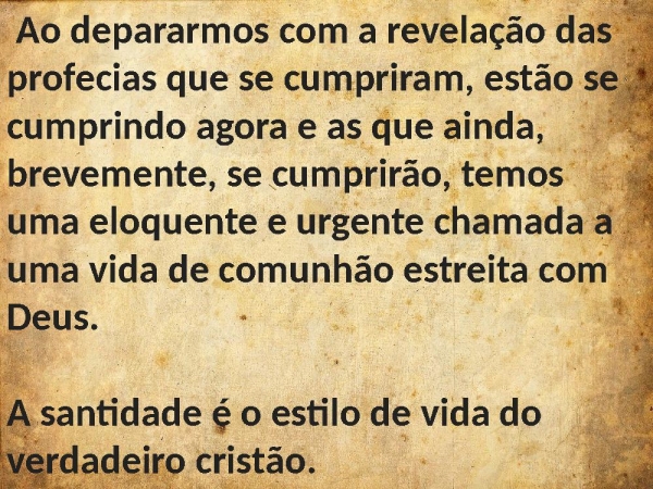 - Ao depararmos com a revelação das profecias que se cumpriram, estão se cumprindo agora e as que ainda, brevemente, se cumprirão, temos uma eloquente e urgente chamada a uma vida de comunhão estreita com Deus. A santidade é o estilo de vida do verdadeiro cristão.