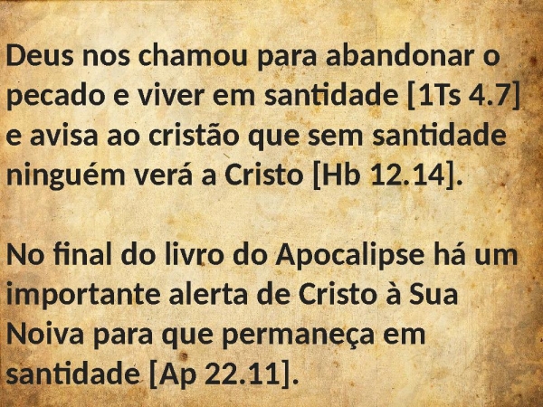 - Deus nos chamou para abandonar o pecado e viver em santidade [1Ts 4.7] e avisa ao cristão que sem santidade ninguém verá a Cristo [Hb 12.14].No final do livro do Apocalipse há um importante alerta de Cristo à Sua Noiva para que permaneça em santidade [Ap 22.11].