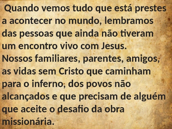 - Quando vemos tudo que está prestes a acontecer no mundo, lembramos das pessoas que ainda não tiveram um encontro vivo com Jesus. Nossos familiares, parentes, amigos, as vidas sem Cristo que caminham para o inferno, dos povos não alcançados e que precisam de alguém que aceite o desafio da obra missionária.