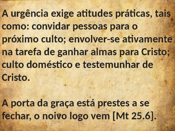 - A urgência exige atitudes práticas, tais como: convidar pessoas para o próximo culto; envolver-se ativamente na tarefa de ganhar almas para Cristo; culto doméstico e testemunhar de Cristo. A porta da graça está prestes a se fechar, o noivo logo vem [Mt 25.6].