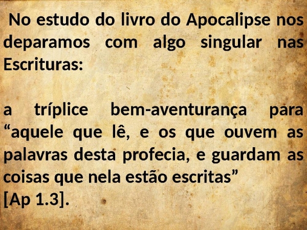 - No estudo do livro do Apocalipse nos deparamos com algo singular nas Escrituras: a tríplice bem-aventurança para “aquele que lê, e os que ouvem as palavras desta profecia, e guardam as coisas que nela estão escritas” [Ap 1.3].