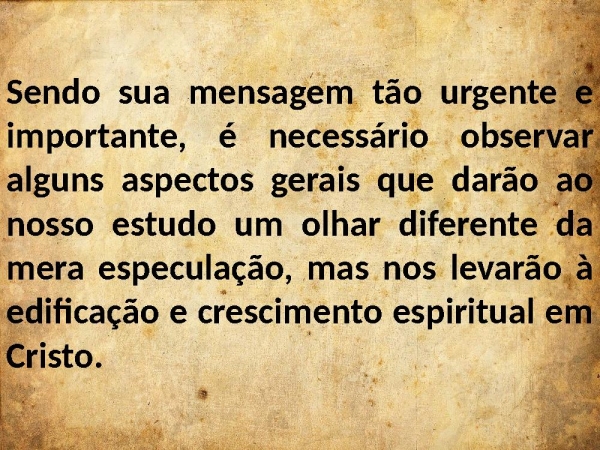 - Sendo sua mensagem tão urgente e importante, é necessário observar alguns aspectos gerais que darão ao nosso estudo um olhar diferente da mera especulação, mas nos levarão à edificação e crescimento espiritual em Cristo.