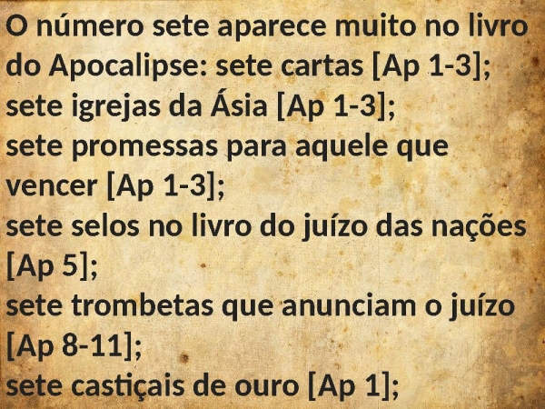 - O número sete aparece muito no livro do Apocalipse: sete cartas [Ap 1-3]; sete igrejas da Ásia [Ap 1-3];sete promessas para aquele que vencer [Ap 1-3]; sete selos no livro do juízo das nações [Ap 5]; sete trombetas que anunciam o juízo [Ap 8-11];sete castiçais de ouro [Ap 1];