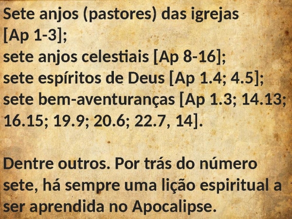 - Sete anjos (pastores) das igrejas[Ap 1-3];sete anjos celestiais [Ap 8-16];sete espíritos de Deus [Ap 1.4; 4.5]; sete bem-aventuranças [Ap 1.3; 14.13; 16.15; 19.9; 20.6; 22.7, 14]. Dentre outros. Por trás do número sete, há sempre uma lição espiritual a ser aprendida no Apocalipse.