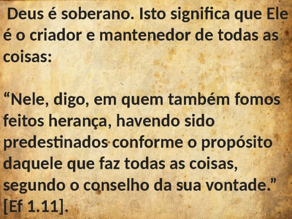 - Deus é soberano. Isto significa que Ele é o criador e mantenedor de todas as coisas: “Nele, digo, em quem também fomos feitos herança, havendo sido predestinados conforme o propósito daquele que faz todas as coisas, segundo o conselho da sua vontade.” [Ef 1.11].