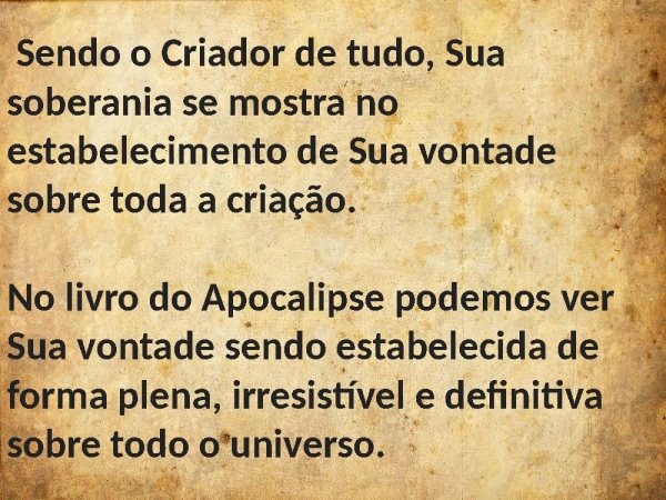 - Sendo o Criador de tudo, Sua soberania se mostra no estabelecimento de Sua vontade sobre toda a criação. No livro do Apocalipse podemos ver Sua vontade sendo estabelecida de forma plena, irresistível e definitiva sobre todo o universo.