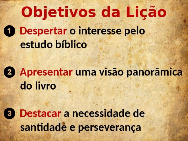 - Objetivos da Lição❶ Despertar o interesse pelo estudo bíblico❷ Apresentar uma visão panorâmica do livro❸ Destacar a necessidade de santidade e perseverança