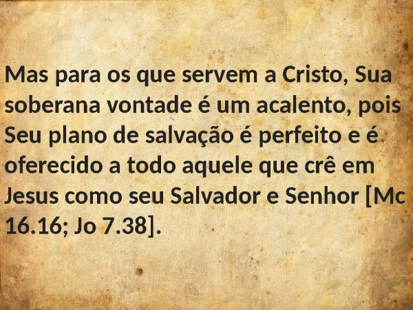 - Mas para os que servem a Cristo, Sua soberana vontade é um acalento, pois Seu plano de salvação é perfeito e é oferecido a todo aquele que crê em Jesus como seu Salvador e Senhor [Mc 16.16; Jo 7.38].