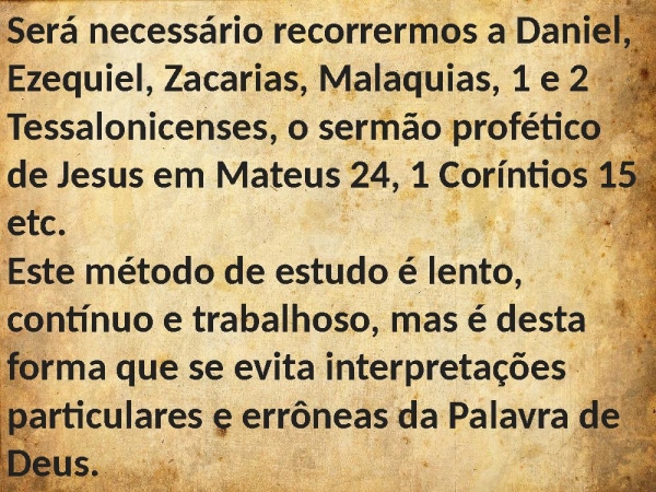 - Será necessário recorrermos a Daniel, Ezequiel, Zacarias, Malaquias, 1 e 2 Tessalonicenses, o sermão profético de Jesus em Mateus 24, 1 Coríntios 15 etc. Este método de estudo é lento, contínuo e trabalhoso, mas é desta forma que se evita interpretações particulares e errôneas da Palavra de Deus.