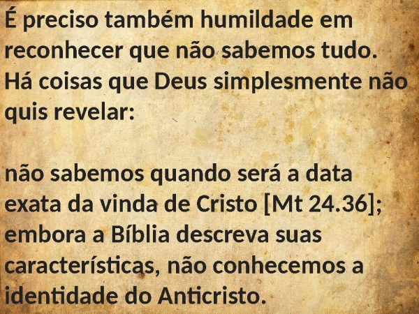 - É preciso também humildade em reconhecer que não sabemos tudo. Há coisas que Deus simplesmente não quis revelar: não sabemos quando será a data exata da vinda de Cristo [Mt 24.36]; embora a Bíblia descreva suas características, não conhecemos a identidade do Anticristo.