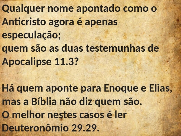 - Qualquer nome apontado como o Anticristo agora é apenas especulação;quem são as duas testemunhas de Apocalipse 11.3?Há quem aponte para Enoque e Elias, mas a Bíblia não diz quem são. O melhor nestes casos é ler Deuteronômio 29.29.