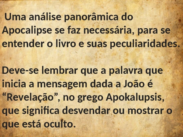 - Uma análise panorâmica do Apocalipse se faz necessária, para se entender o livro e suas peculiaridades.Deve-se lembrar que a palavra que inicia a mensagem dada a João é “Revelação”, no grego Apokalupsis, que significa desvendar ou mostrar o que está oculto.