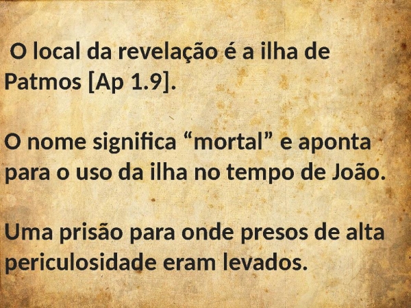 - O local da revelação é a ilha de Patmos [Ap 1.9].O nome significa “mortal” e aponta para o uso da ilha no tempo de João.Uma prisão para onde presos de alta periculosidade eram levados.