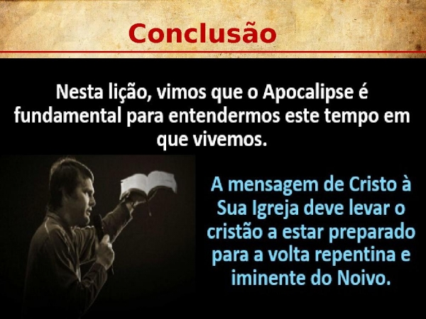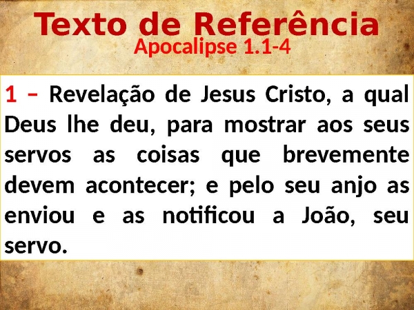 - Texto de Referência Apocalipse 1.1-41 – Revelação de Jesus Cristo, a qual Deus lhe deu, para mostrar aos seus servos as coisas que brevemente devem acontecer; e pelo seu anjo as enviou e as notificou a João, seu servo.