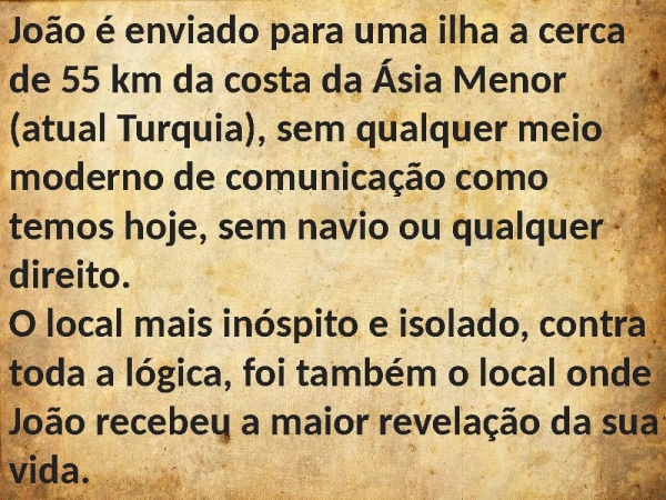 - João é enviado para uma ilha a cerca de 55 km da costa da Ásia Menor (atual Turquia), sem qualquer meio moderno de comunicação como temos hoje, sem navio ou qualquer direito. O local mais inóspito e isolado, contra toda a lógica, foi também o local onde João recebeu a maior revelação da sua vida.