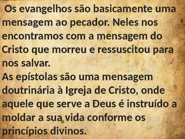 - Os evangelhos são basicamente uma mensagem ao pecador. Neles nos encontramos com a mensagem do Cristo que morreu e ressuscitou para nos salvar.As epístolas são uma mensagem doutrinária à Igreja de Cristo, onde aquele que serve a Deus é instruído a moldar a sua vida conforme os princípios divinos.
