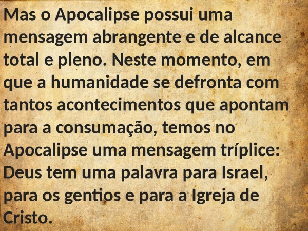 - Mas o Apocalipse possui uma mensagem abrangente e de alcance total e pleno. Neste momento, em que a humanidade se defronta com tantos acontecimentos que apontam para a consumação, temos no Apocalipse uma mensagem tríplice: Deus tem uma palavra para Israel, para os gentios e para a Igreja de Cristo.