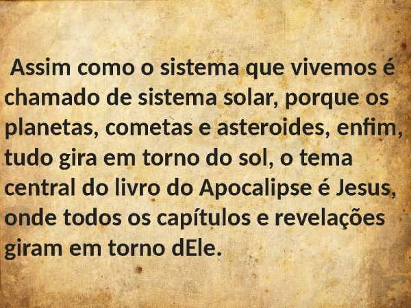 - Assim como o sistema que vivemos é chamado de sistema solar, porque os planetas, cometas e asteroides, enfim, tudo gira em torno do sol, o tema central do livro do Apocalipse é Jesus, onde todos os capítulos e revelações giram em torno dEle.