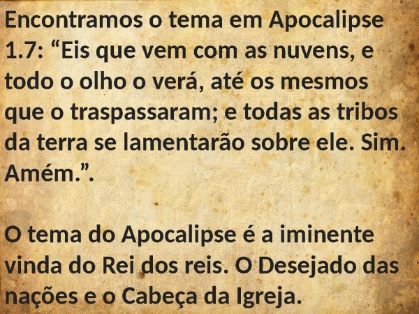 - Encontramos o tema em Apocalipse 1.7: “Eis que vem com as nuvens, e todo o olho o verá, até os mesmos que o traspassaram; e todas as tribos da terra se lamentarão sobre ele. Sim. Amém.”. O tema do Apocalipse é a iminente vinda do Rei dos reis. O Desejado das nações e o Cabeça da Igreja.