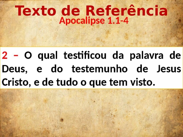 - Texto de Referência Apocalipse 1.1-42 – O qual testificou da palavra de Deus, e do testemunho de Jesus Cristo, e de tudo o que tem visto.