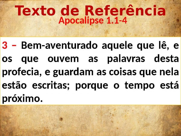 - Texto de Referência Apocalipse 1.1-43 – Bem-aventurado aquele que lê, e os que ouvem as palavras desta profecia, e guardam as coisas que nela estão escritas; porque o tempo está próximo.