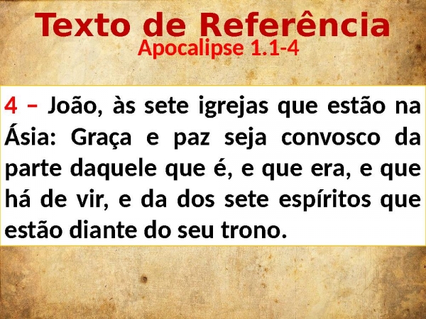 - Texto de Referência Apocalipse 1.1-44 – João, às sete igrejas que estão na Ásia: Graça e paz seja convosco da parte daquele que é, e que era, e que há de vir, e da dos sete espíritos que estão diante do seu trono.