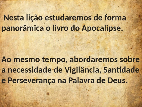 - Nesta lição estudaremos de forma panorâmica o livro do Apocalipse. Ao mesmo tempo, abordaremos sobre a necessidade de Vigilância, Santidade e Perseverança na Palavra de Deus.